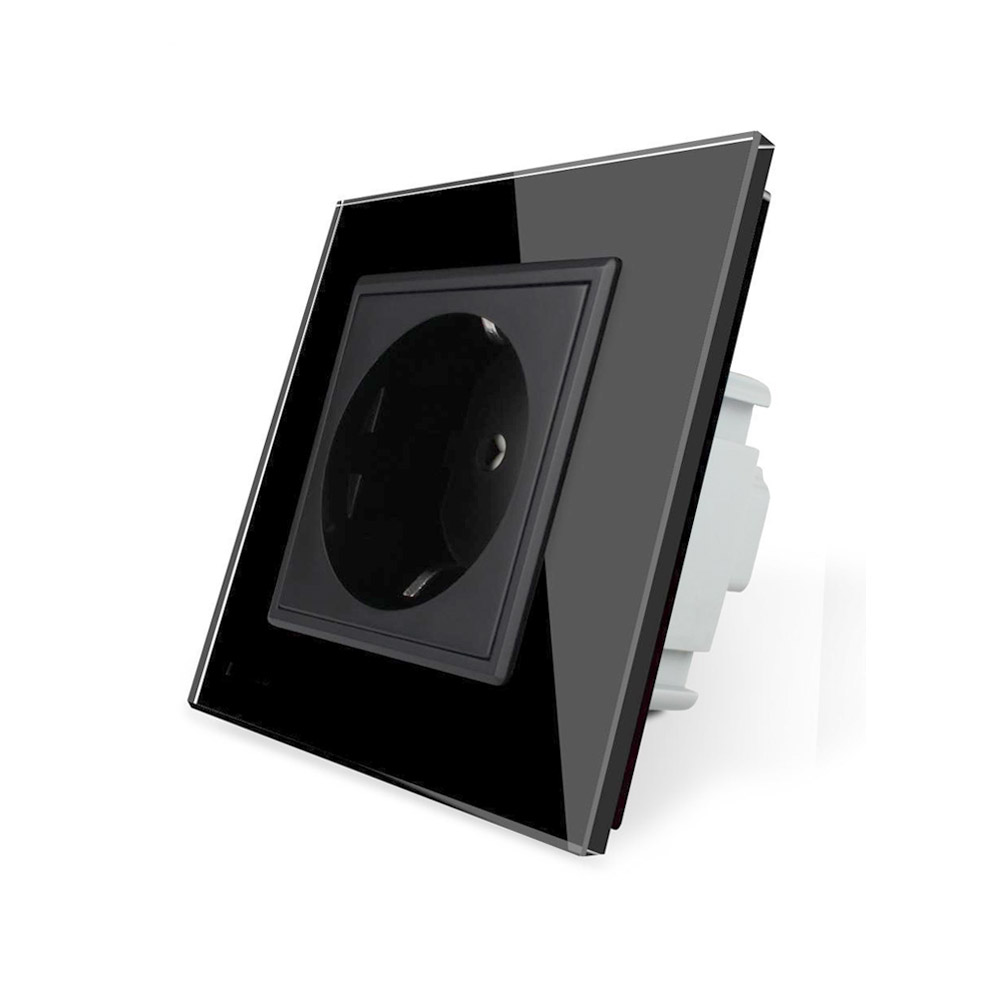 Enchufe tipo SCHUKO EU de 16A negro, compuesto de mecanismo (base) + clavija plástico + panel frontal vidrio. Mecanismo eléctrico de empotrar con cuerpo de aluminio y panel frontal de cristal templado con acabado de alta calidad y diseño minimalista. Incluye marco interior del color del cristal.