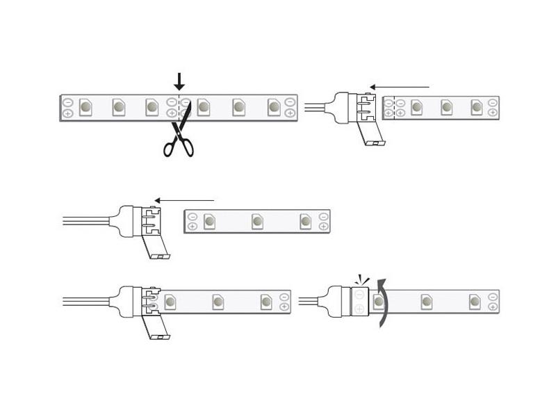 Este conector es necesario para las tiras de LED monocolor (2 Pin) de 10mm de ancho. De muy fácil instalación, solo tienes que cortar la tira led por las líneas de corte, insertar el extremo en el conector rápido y crimpar. Instalación fácil, limpia y rápida.