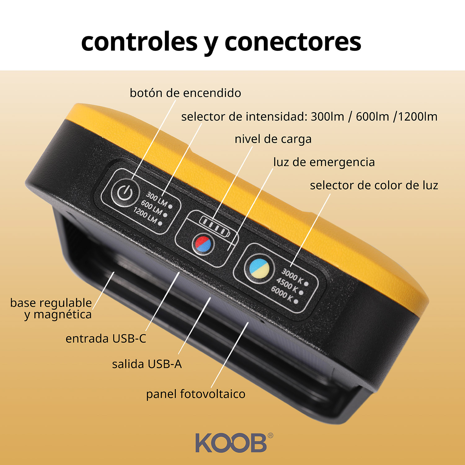 Dispone de un completo panel de control, con indicación de carga solar, estado de batería, selector de color y selector de intensidad, todo ello con leds indicadores de estado.